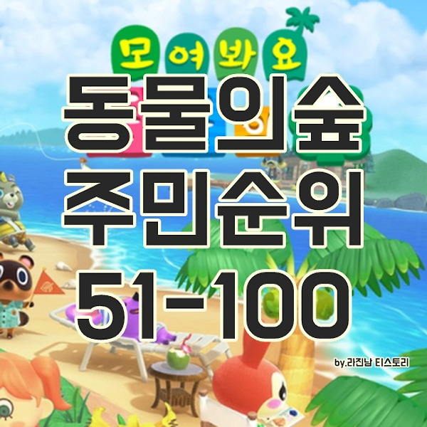 모여봐요 동물의 숲 주민순위 51~100위까지 알아보기 안녕하세요. 라진남입니다. 이번 포스팅은 모여봐요 동물의 숲 주민 순위 51위부터 100위까지의 순위에 대한 내용으로 찾아왔습니다. 동물의 숲 주민 순위는 인기 순위라고 보시면 될 것 같아요. 순위 변동은 계속 있기 때문에 411마리의 주민 중 51-100위 사이의 상위권에 위치한 주민들에 대한 자세한 정보들을 가져왔습니다. 순위, 이름, 성별, 성격, 생일, 별자리, 특기, 좋아하는 색, 가족, 좋아하는 말, 장래 희망 등 주민들에 대한 세세한 정보까지 모두 적어보았습니다! 주민을 데려올 때 저는 생김새도 중요하지만 말투도 많이 보고 데려오고는 합니다. 그래서 말버릇을 필수?로 보게 되더군요. 많은 주민들 중에서 최대한 보기 편하도록 표로 간단하게..